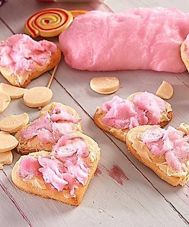 Tereyağı, pudra şekeri, yumurta akı, tuz ve vanilyayı bir kapta karıştırın. Unu yavaş yavaş ekleyip çok sert olmayan bir hamur elde edin. Tezgaha un serpip merdane yardımıyla hamuru açın ve kurabiye kalıpları ile kesin. Kurabiyeleri yağlı kağıt koyduğunuz fırın tepsisine yerleştirin. 180 derecede 8-10 dakika pişirin. Pişen kurabiyeleri tel ızgara üzerine alın ve soğuması için bekletin. Beyaz çikolatayı benmari usulü eritin. Soğumuş kurabiyeleri erittiğiniz çikolataya batırın. Pamuk şeker ile süsleyip servis edin.